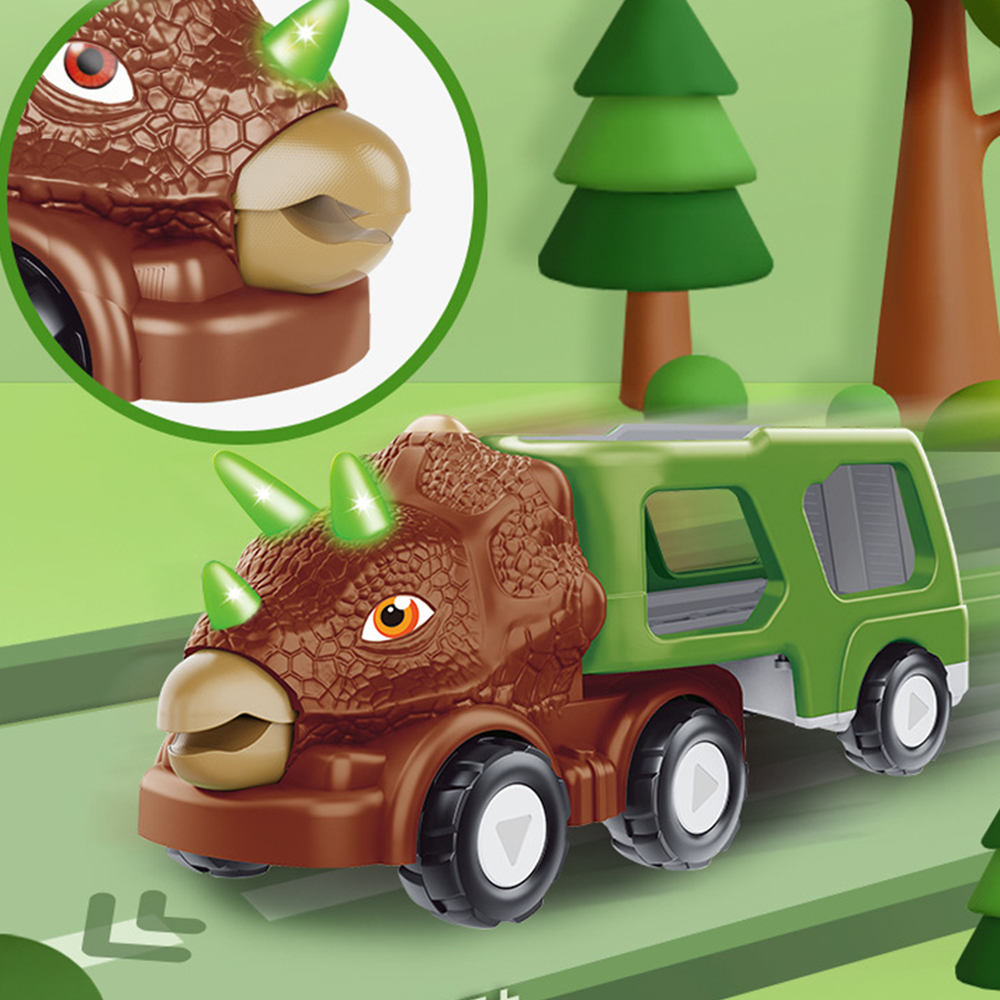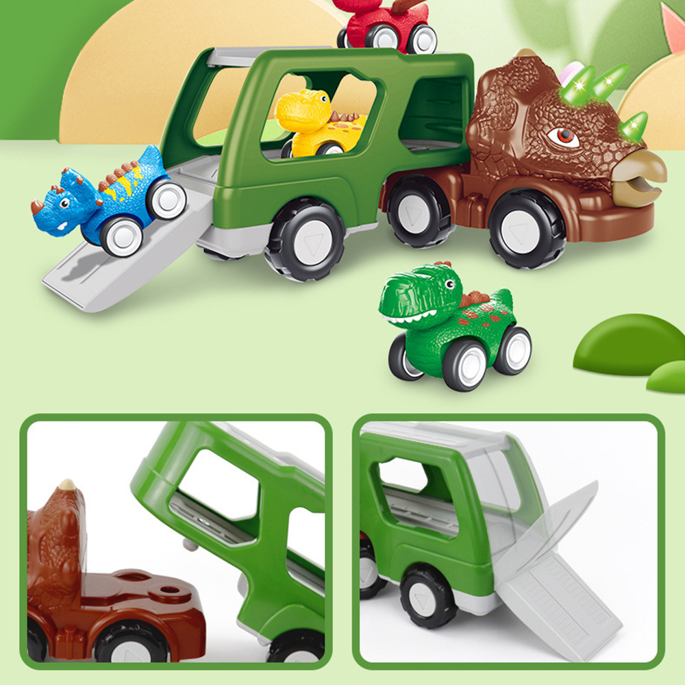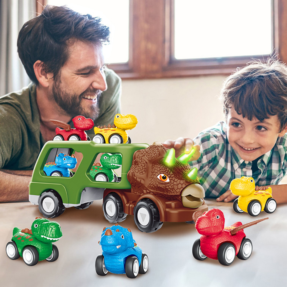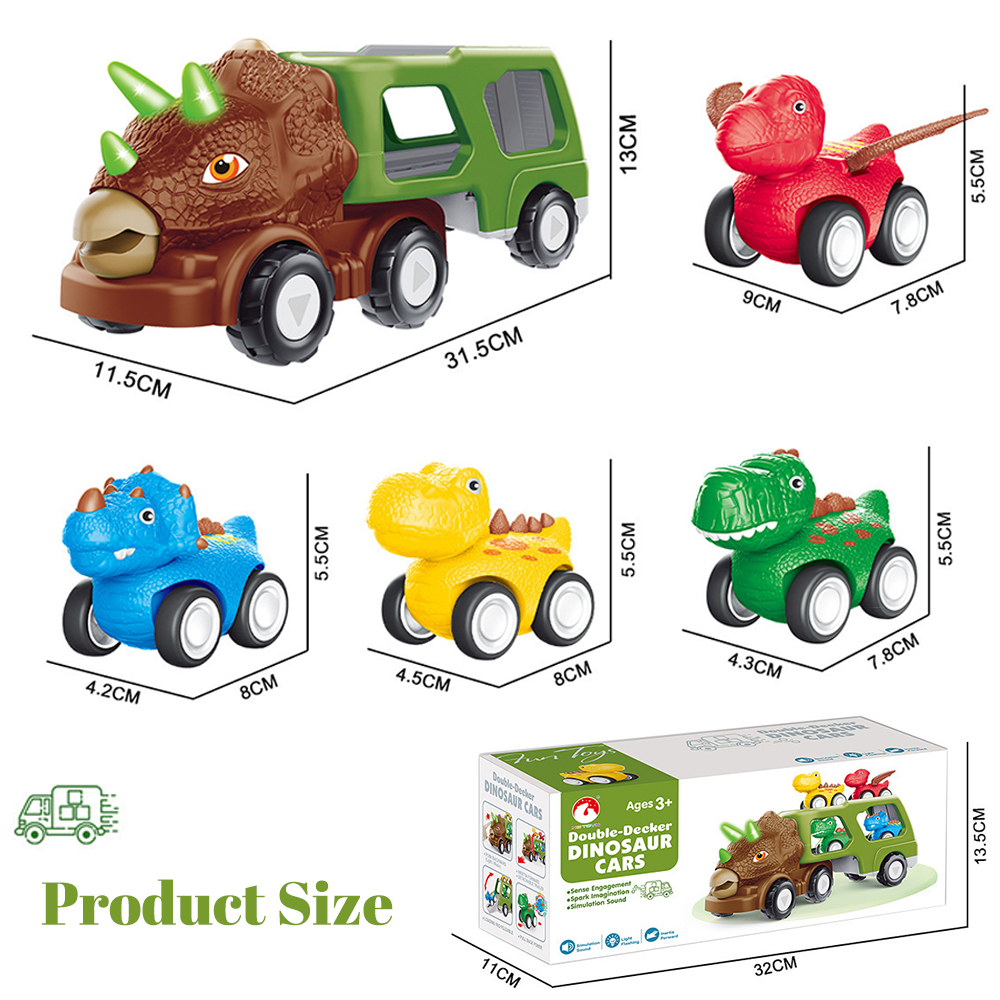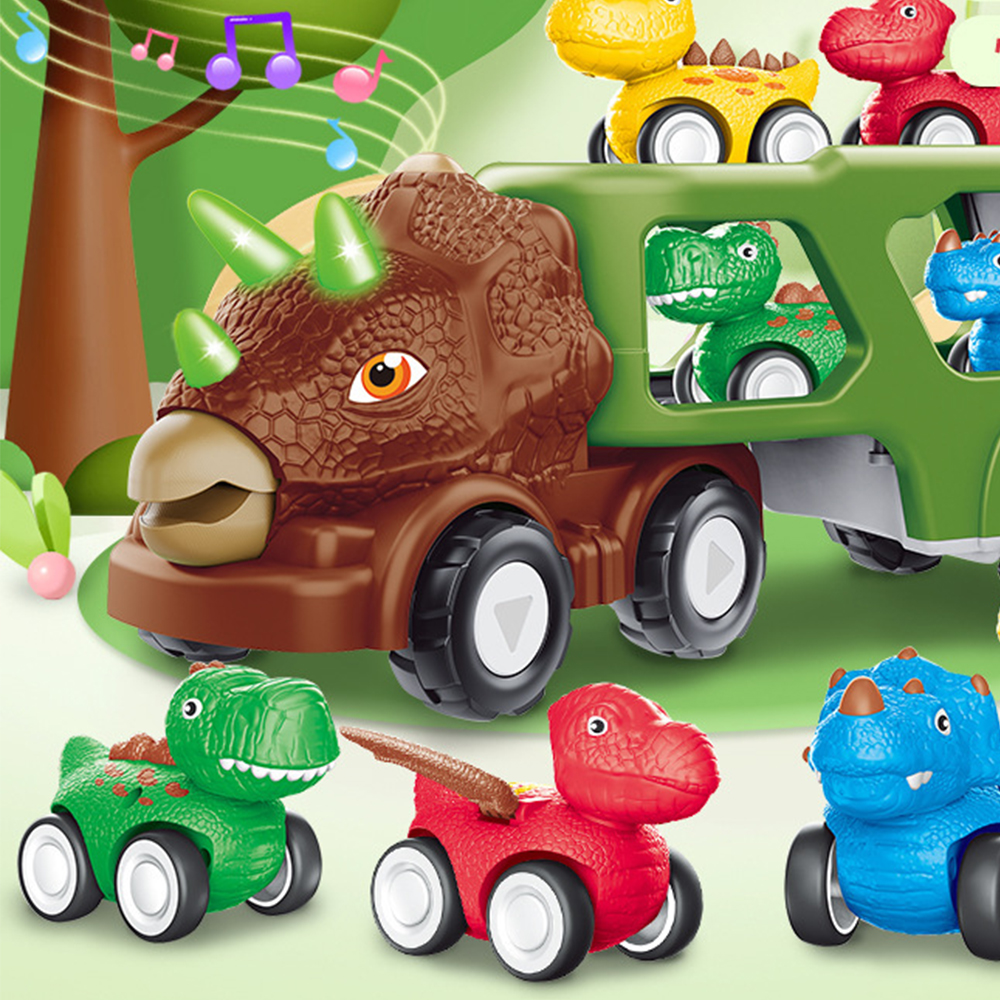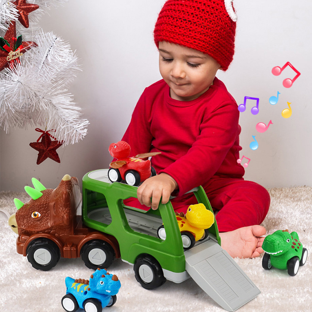 Our dinosaur truck toys can take kids into the real world of dinosaurs.Push dinosaur horn to the right, that can hear the realistic dino sounds and see the flashing lights.Each touch will only produce about 20 seconds of light and sounds.No worries about being too noisy.Warm Tips: This function requires installation of 3 X AA batteries (not supplied).Our toddler toys dinosaur truck with double layer design.The head of the large toddler trucks can also be rotated through 180 degrees.The head of each mini dinosaur car can rotate 60 degrees and make a "click" sound.Ideal for small hands due to its size.Friction power vehicle.A big dinosaur car pushes trucks slightly forward.Unload the small dinosaur cars by opening the tailgate.Pull back a certain distance and release, and toddler toys it automatically moves forward.Let your kids experience the fun of sliding with the toddler boy toys.Designed with child safety in mind, the round design of the set and the high quality, non-toxic rubber material of the cars ensure a safe and enjoyable play environment.The bright colors and dinosaur theme will keep your child engaged in imaginative play.Perfect toddler toys for ages 1-5.Great activities for boys aged 1-5 featuring monster truck car games and toy cars for toddlers.Warm Tips: The packaging indicates 3+ because supervision is necessary for children under 3 years old for added safety.Our toddler toys for boys not only enhance children's fun but also improve their hand-eye coordination and stimulate their curiosity to explore the fascinating world of dinosaurs.Great toys for kids ages 1-5. Great toys for boys ages 1-5. The toddler toys are perfect for holidays, birthdays, or daily gifts. They're sure to brighten up any young boy's day.